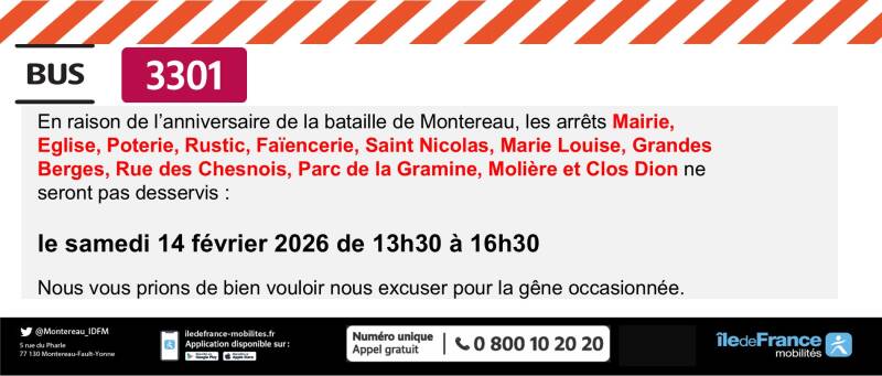 En raison de travaux dans la Grande Rue : les arrêts Église de Varennes(direction gare de Montereau),Maison Rouge ne seront pas desservis.
